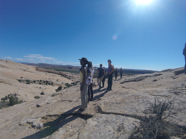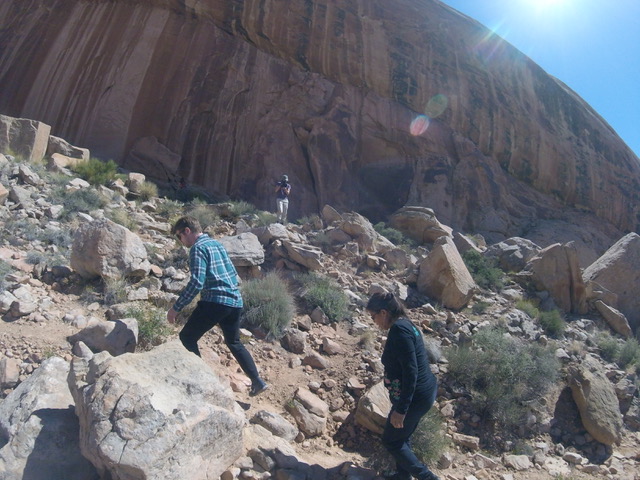 A month after the Dabke concert, Gotheiner returned to Utah with five of his own dancers to join RDT’s dancers, staff and a pair of Navajo guides to visit Bears Ears in preparing to choreograph the new work. Smith, who explains that Red Rock Stories and Edge of Morning were important foundational texts in preparing for the creative process in this project, documented the experiences of this expedition in several RDT blog posts. During the trip, the group visited many sites in the area. Their stops included the Fry Canyon Ruin, the steep switchbacks of Moki Dugway, a kiva at the Cave Tower Ruin, a hike at the Procession Panel and a community gathering in Bluff Utah.