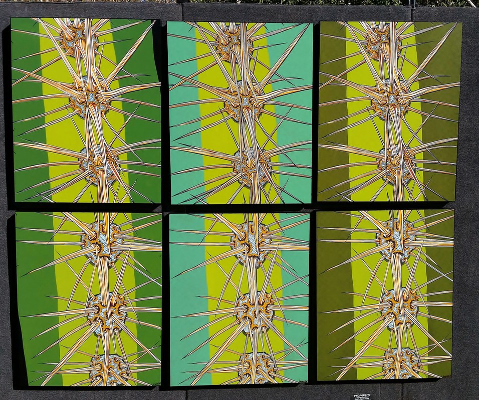 The challenge became how to keep the piece interesting enough for Steve to work on with his aesthetic but retain the look I wanted that would be bold and different enough that it would not be a direct interpretation of the image I took. The goal was that whatever we ended up with would be a piece that would be graphic enough that people wouldn’t even really know what it was. So as we talked it through we decided to make it twice as big first. Then as the background printing began the whole piece took a drastic and for us a risky turn. What if we made three different pieces with different backgrounds? Since we only had enough paper for six individual panels that meant there would only be two full sets when we were done. That’s if nothing went wrong! So we moved forward and kept cutting.