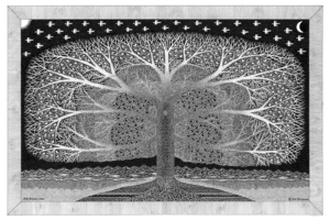A self-taught pen-and-ink artist, Helman refers to his style as ‘maximalist,’ blending in themes that can be about nature, animals or music with decorate elements and folk art shapes, patterns and images. Much of his work is intended as a cultural commentary, as suggested by the surreal and even cartoon-like tone of his drawings. The concept of maximalism is essentially packing as many line elements as possible in a tight space of creative expression, all while representing as many different aesthetic styles. His work naturally is time and labor intensive. Originally inspired to do pencil sketches as part of his music projects, Helman now works with large-format pen drawings, primarily using Micron pens on drawing paper.
