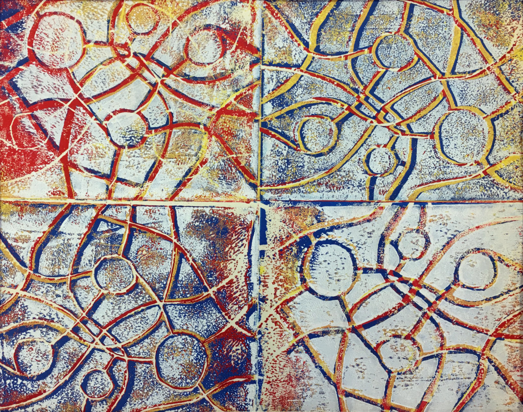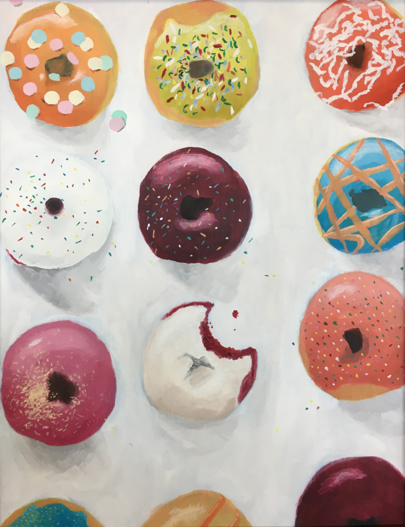 The art represents many media forms, including drawing, painting, watercolor, sculpture, fiber, printmaking, jewelry, photography, ceramics, and various commercial and mixed media. Students are ambitious and meticulous in their creative process. For her work, Campbell said the background pattern was influenced by religious mosaic works dating to ancient Rome. “I love painting along to audio books; this one I did while listening to a copy of the classic Jane Eyre,” she adds.