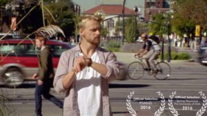 The Timekeeper (Peter Davidson, 3 min., A University of Utah Department of Film Studies Production, 2015) is an experimental piece with a tantalizing epiphany. The character’s watch is precise so that when he winds his watch backwards, time moves accordingly and when he stops his watch, time stops. The timekeeper walks around the city, occasionally quoting Kahlil Gibran or Lord Byron. There also is a scene showing still photo images behind him while he is walking that communicates the illusion.