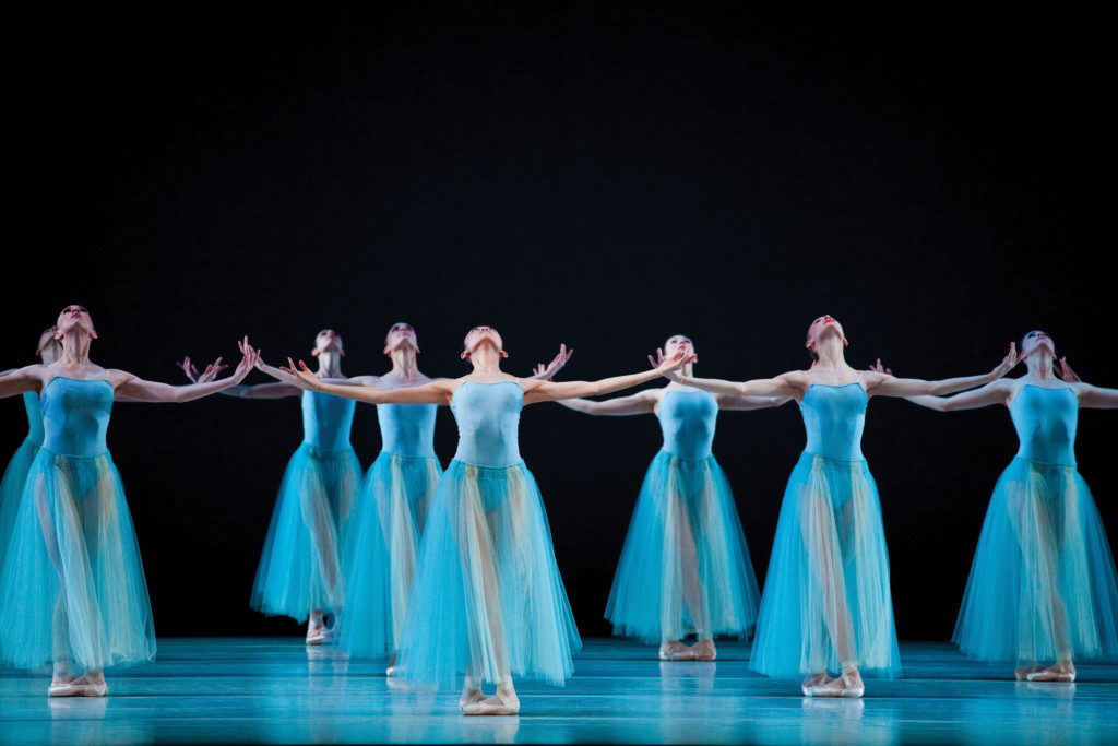 Serenade was the first original ballet Balanchine created in America and is performed to Tchaikovsky’s Serenade for Strings. The work features four movements—“Sonatina,” “Waltz,” “Russian Dance” and “Elegy”—performed by a multitude of ballerinas in blue tulle skirts costumes in front of a blue background.