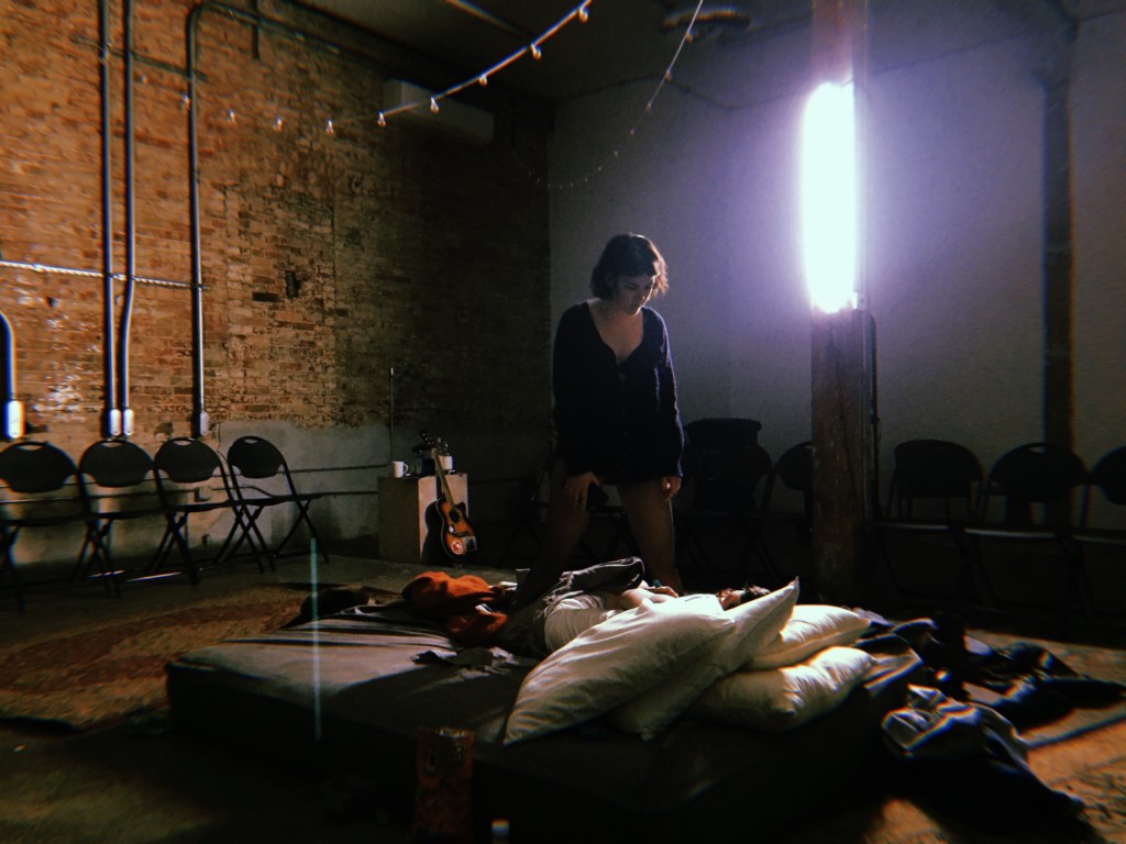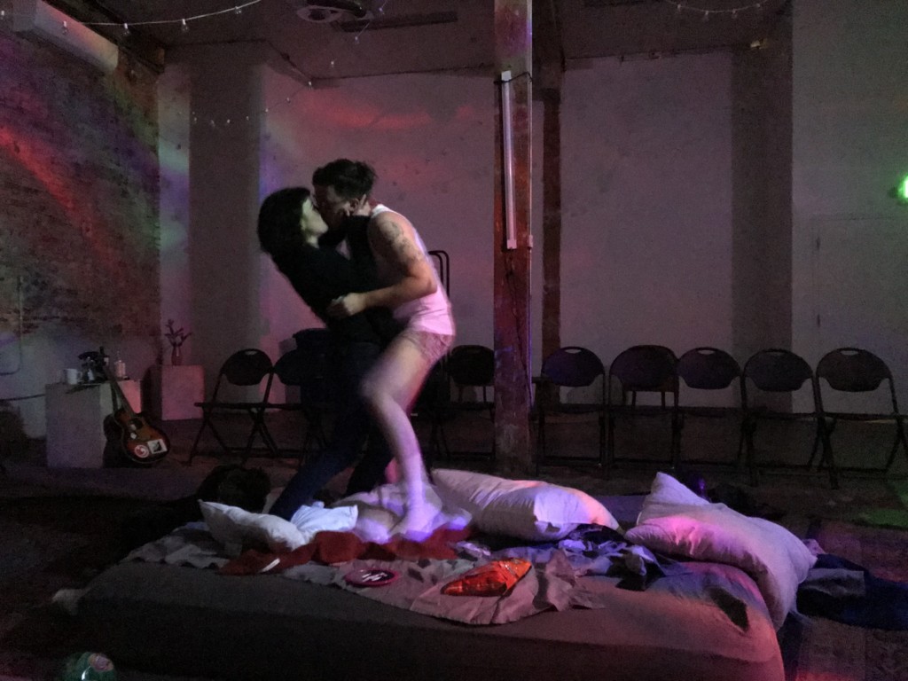 In the appropriately cacophonous opening, Ratio is hyper, sweating, clad in a tight-fitting pair of sexy boxer briefs, as he mimes scribbling lots of mathematical equations, variables and symbols on an invisible ‘mainframe,’ a white board with erasable marker. Mouse is clad in stockings and lingerie on a mattress with the covers thrown haphazardly and trash strewn about the low-rise bed. In the script, Hertford envisions Mouse as resembling actors Jean Seberg and Anna Karina, who were stars of the French New Wave cinematic movement and became the muses of some of the period’s most prominent film directors in France. Steele does emanate the free-love heroine aura at many points in the play, convincing in evoking the right pallor for the character. Archer achieves an intriguing resemblance to the sort of not-so-secure porn star character one would have found in the brilliant Boogie Nights film, which Paul Thomas Anderson directed in 1997.