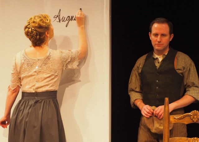 Larson, an award-winning Utah playwright, has produced a fascinating, cogent interpretation of Emma Hauck’s story, which is equal to the artistic impact of the short film made nearly two decades earlier. Larson sets the play, beginning in August 1908, with the same basic details of her subject’s actual life. Michael, the husband, was a teacher in Mannheim. They had two children (who are mentioned in the play). Larson’s cast for the 80-minute play comprises three actors: Emma (Christy Summerhays), Michael (Patrick Kintz) and August, the gardener (Roger Dunbar). Mark Fossen directs the production.