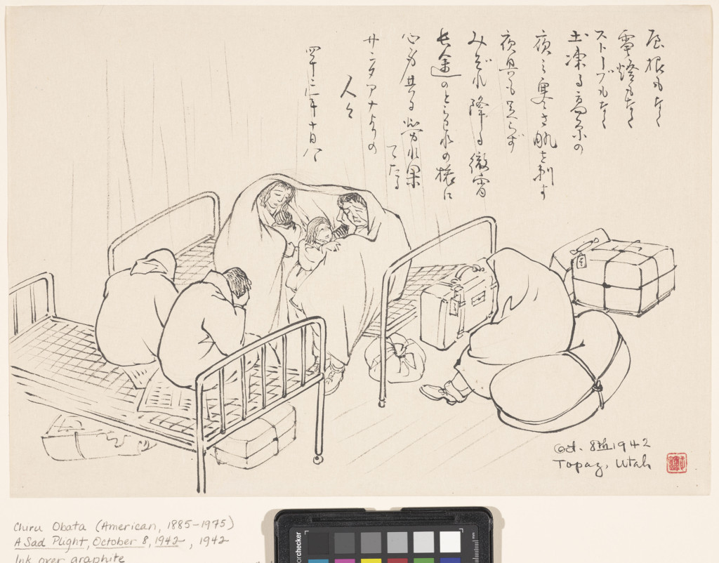 It is a disservice to characterize Obata as a Japanese-American artist. He was quintessentially American in how he captured many iconic moments of the nation’s history – from specifically labeled scenes he sketched after the 1906 earthquake in San Francisco to the college vibe of the University of California-Berkeley campus where he taught art and to the Sierras. But, he also captured another part of American history, beginning April 30, 1942, when the Japanese residents of Berkeley departed for an unknown future in internment camps. Obata and his family were originally housed in the former Tanforan racetrack and horse stables which were converted to barracks. They were moved in the fall of 1942 to Topaz in southern Utah.