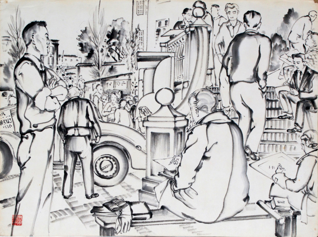 As he continued to produce works, some of which have never been previously shown in public exhibitions until the UMFA show, he also created an art school, which his granddaughter said, echoed his belief in the “power of creativity to raise the spirits of his fellow internees.” Within a month, the school had more than 600 students. Hall, as she recalled in the 2002 lecture, said the school was entirely accomplished with their own funding and from donations of friends at UC-Berkeley.