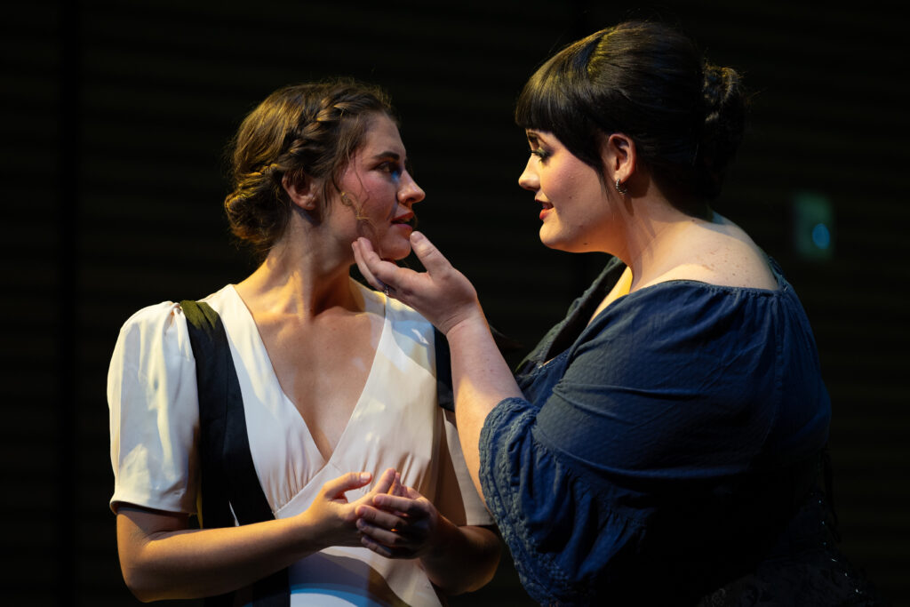 Directed by Ellie Otis, the production hits effectively on these themes, particularly with good to strong acting in the cast, as evidenced in the Nov. 15 performance. Each of the characters evolve in this bleak isolated setting and all but Agatha are chasing after happiness. Residing in this secluded mansion on the moors are Agatha (Viviane Turman) and Huldey (Addilynn Bowler), sisters, and their maid Marjory/Mallory (Nicole Finney), who has a split personality, and the Mastiff (Alvaro Cortez). Emilie (Jessica Graham) is the governess who travels from bustling London to this last stop of civilization. Master Branwell, the brother of Agatha and Huldey, is the unseen character.