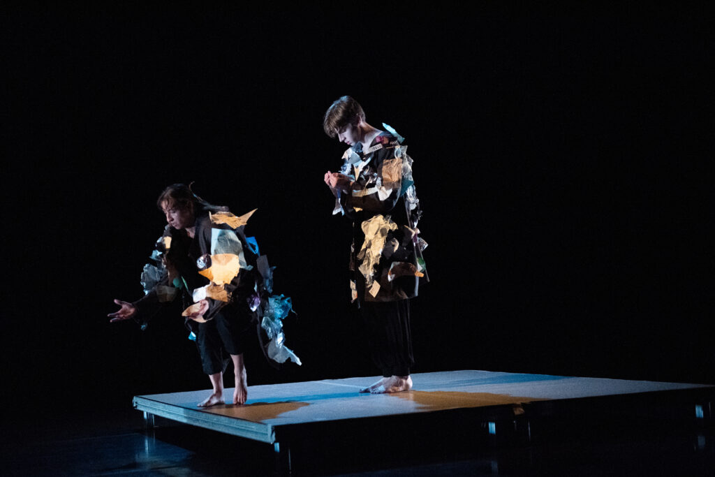 It was heartening to see the extent of community presence on stage, with more than 75 dancers outside of the company joining in Emerge. Eleven dancers from the South Valley Creative Dance studio were delightful to see in Nicholas Cendese’s At the Edge of an Ending, with music by the Latvian composer George Pelecis. Working with 11 dancers from Weber State University, RDT company dancers Caleb Daly and Caitlyn Richter set an intriguing piece,No Sense, to music by The Art of Noise, a British group that pioneered the use of sampling in commercial electronic music. Daniel Do recreated the Folded Landscapes, a work that he set for a duet of Westminster University dancers for a concert last fall. The work was created with the requirements that all movement had to be set within a space measuring eight feet by eight feet, with a duration of eight minutes or less, and with only eight hours of rehearsal time. Ingeniously resourceful, the piece touched on themes about the environment and opportunities to nurture practical wisdom about sustainability, resource conservation and scarcity.